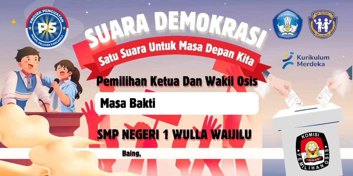 Wulla Waijelu, 26 Oktober 2024 – Dalam upaya membangun karakter peserta didik yang demokratis dan berjiwa pemimpin, SMP Negeri 1 Wulla Waijelu melaksanakan rangkaian kegiatan Proyek Penguatan Profil Pelajar Pancasila (P5) dengan tema “Suara Demokrasi.” Salah satu kegiatan utamanya adalah Pemilihan Ketua dan Wakil Ketua OSIS untuk periode 2024-2025. Melalui kegiatan ini, siswa diharapkan dapat menginternalisasi nilai-nilai demokrasi dan belajar secara langsung tentang pentingnya kepemimpinan, hak suara, serta tanggung jawab sebagai warga negara.