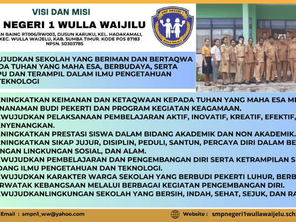 Berikut Visi dan Misi SMP Negeri 1 Wulla Waijelu   VISI “Mewujudkan sekolah yang Beriman dan Bertaqwa kepada Tuhan Yang..