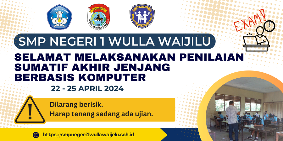 Diberitahukan kepada seluruh siswa, guru, dan orang tua/wali murid bahwa akan dilaksanakan Ujian Sumatif Akhir bagi peserta didik kelas 9 SMP Negeri 1 Wulla Waijelu.